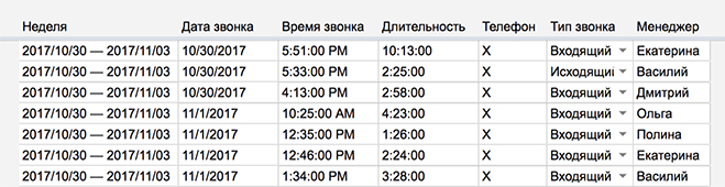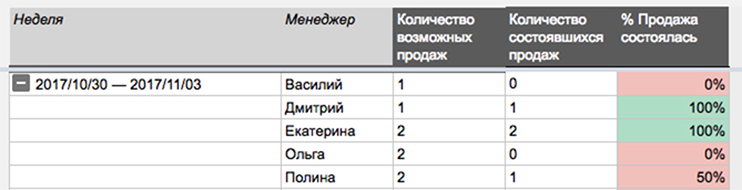 Если звонок целевой — это возможная продажа. Всё, что нужно — правильно её провести, поэтому успех зависит от действий менеджера. В этой таблице видно, сколько возможностей было у менеджеров и сколько из них удалось завершить продажей. В нашем примере проблемы видны у двух менеджеров — Василия и Ольги, потому что они не закрыли ни одной целевой сделки.