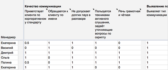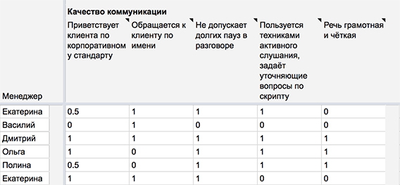 Если выполнен, но не до конца, ставим «0.5». Например, если менеджер спросил имя клиента в начале разговора, но больше по нему не обращался, критерий «приветствие по корпоративному стандарту» выполнен не до конца;