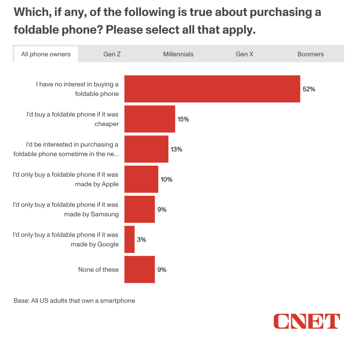52% опрошенных идея покупки такого телефона не интересна. Незаинтересованных бумеров еще больше — 60%. Даже 47% зумеров придерживаются такого мнения. 15% респондентов могли бы купить складной телефон, если бы цены были ниже.