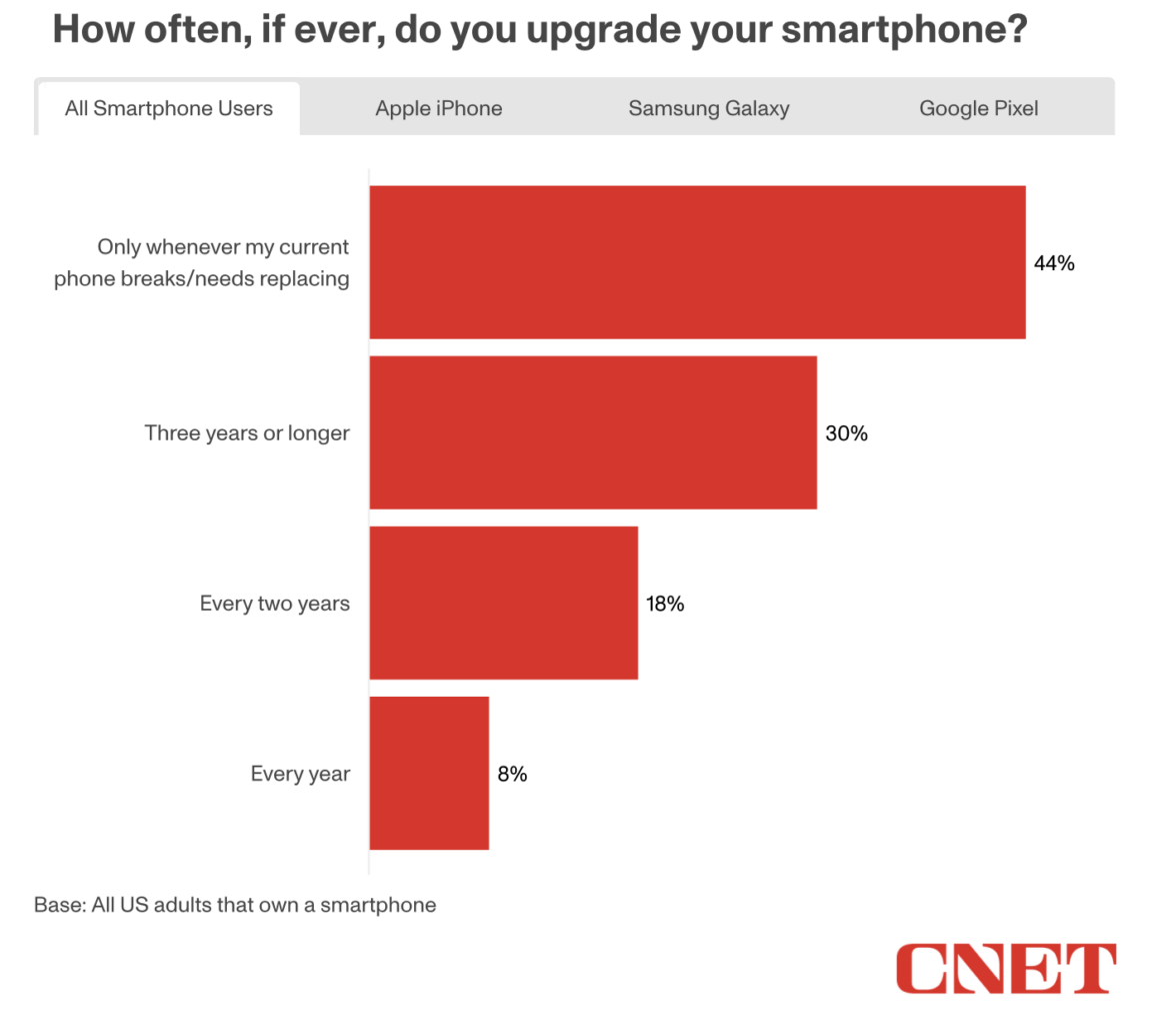 44% участников опроса заявили, что меняют смартфон лишь в случае, если он сломается или будет нуждаться в замене. 30% делают это реже, чем раз в три года. 18% — каждые два года. 8% — ежегодно. При этом цифры, названные отдельно владельцами iPhone, Google Pixel и Samsung Galaxy, не сильно отличаются.
