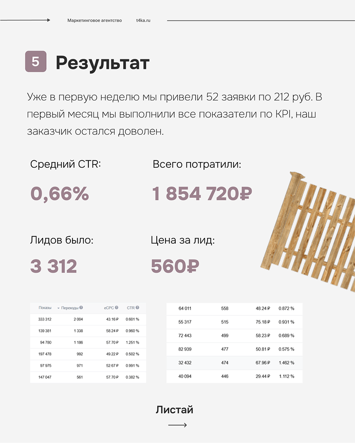 Уже в первую неделю мы привели 52 заявки по 212 руб. В первый месяц мы выполнили все показатели по KPI, наш заказчик остался доволен.