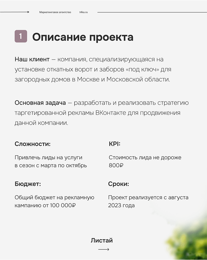 В этом кейсе агентство «В точку» показывает, как эффективно привлекать целевые заявки на установку заборов и откатных ворот для загородных домов, используя таргетированную рекламу ВКонтакте.