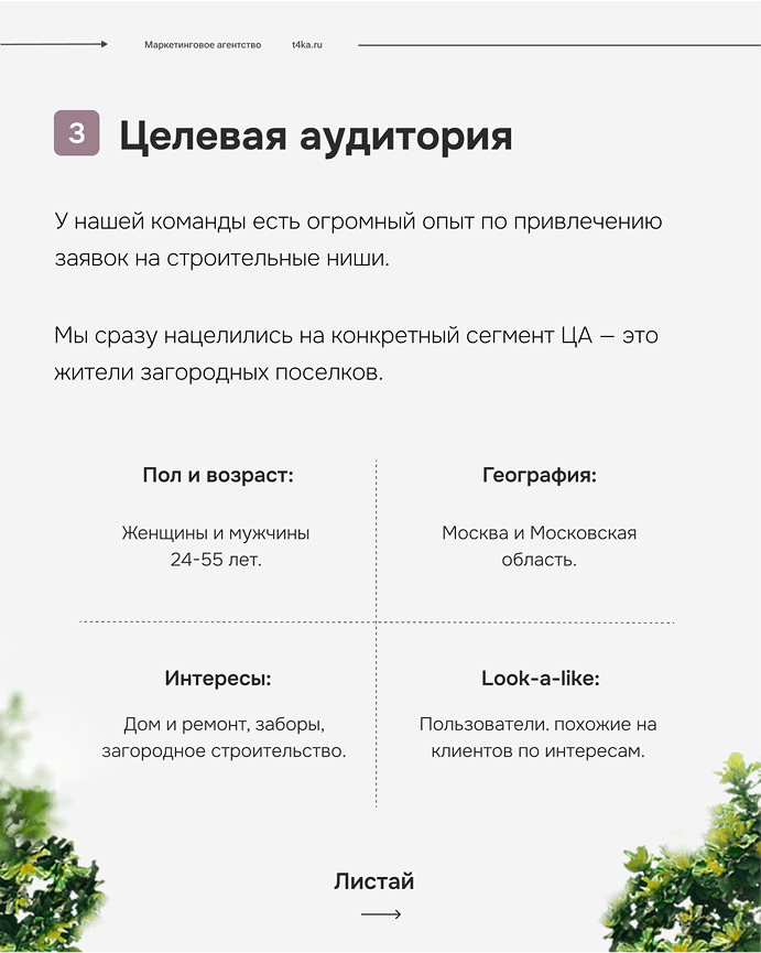 Пол и возраст: женщины и мужчины 24–55 лет. Это возрастная группа, наиболее платежеспособная и активная в сфере строительства и обустройства загородной недвижимости.