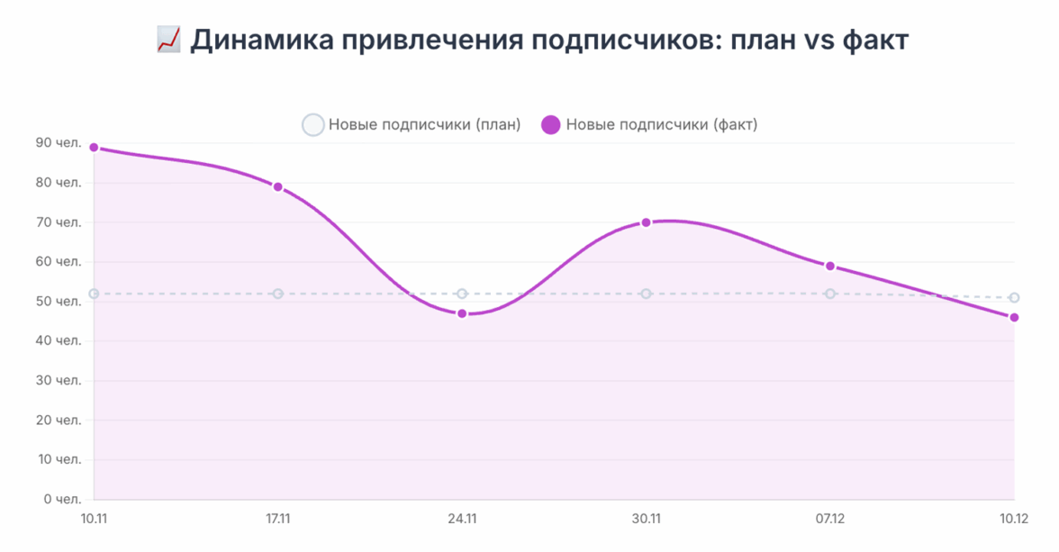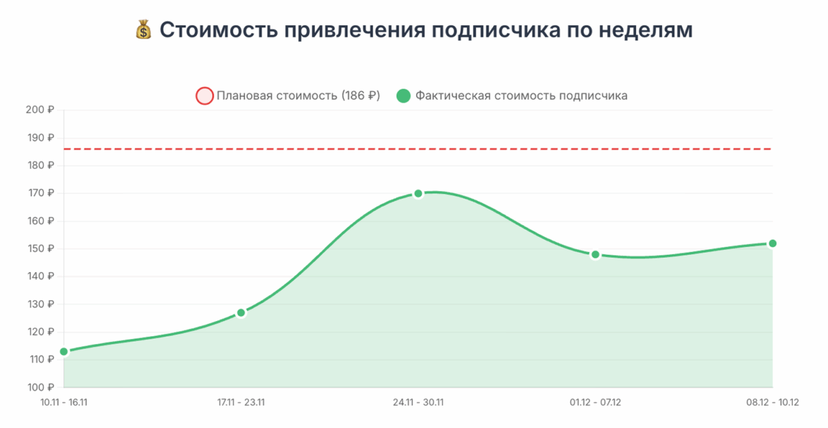 Еженедельная динамика: видно, как мы удерживали стоимость подписчика в рамках KPI