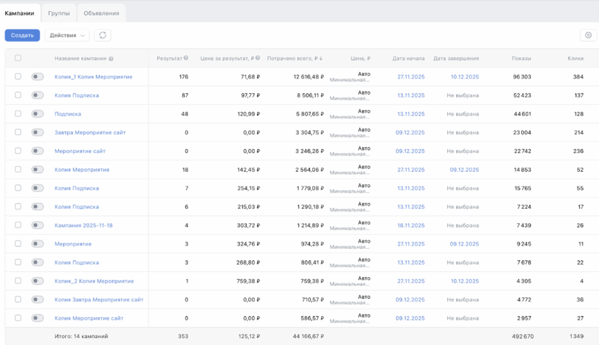 Данные из рекламного кабинета VK Ads с детальной статистикой кампаний