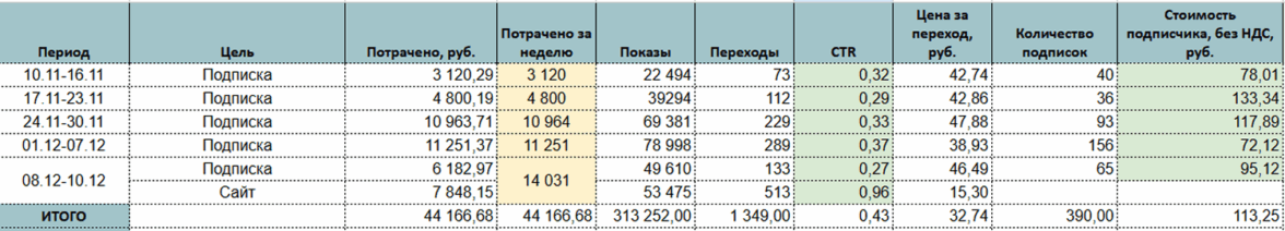 Все решения принимались на основе еженедельных срезов данных (см. скриншоты отчетов). Мы видели, что в период с 24.11 по 30.11 цена подписки немного выросла, и оперативно скорректировали кампании, переключив бюджет на более дешевые связки.