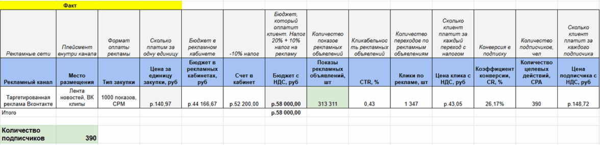 Количество подписчиков: План — 311 чел. → Факт — 390 чел. Мы перевыполнили план на 25%
