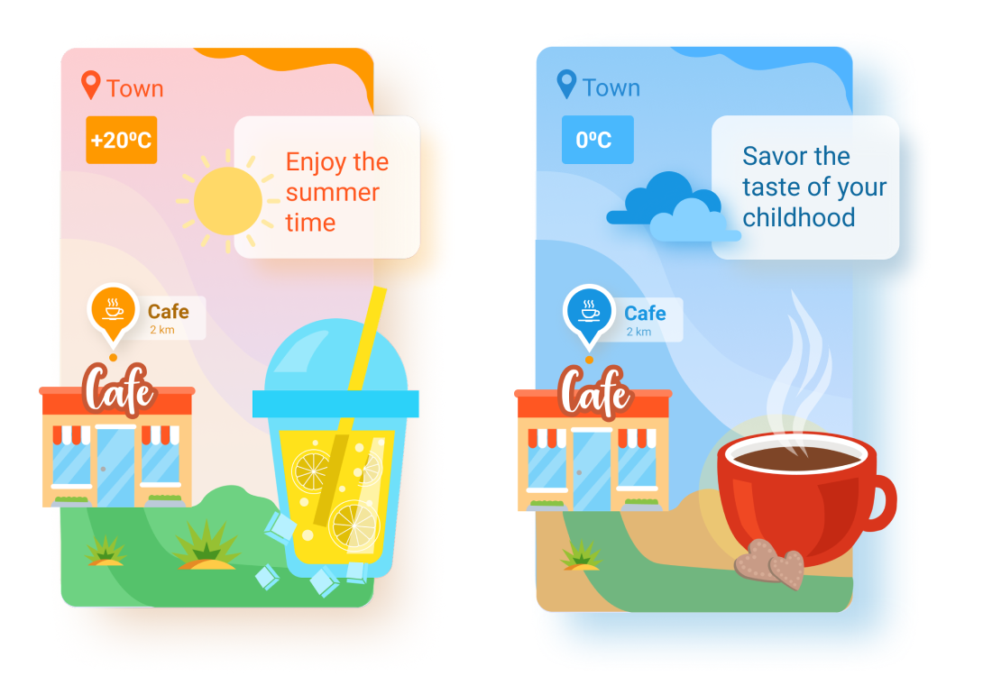 Сфера общепита также может использовать триггер по погоде в своих рекламных кампаниях. Актуальность креатива увеличится, если в жаркую погоду пользователь увидит рекламу освежающего лимонада, а в холодную — предложение согреться горячим кофе или какао. А сочетание с hyperlocal таргетингом (показывать рекламу пользователям, находящимся в радиусе от 200 м до 1,5 км от заданного места) позволить максимально точечно охватить целевую аудиторию.
