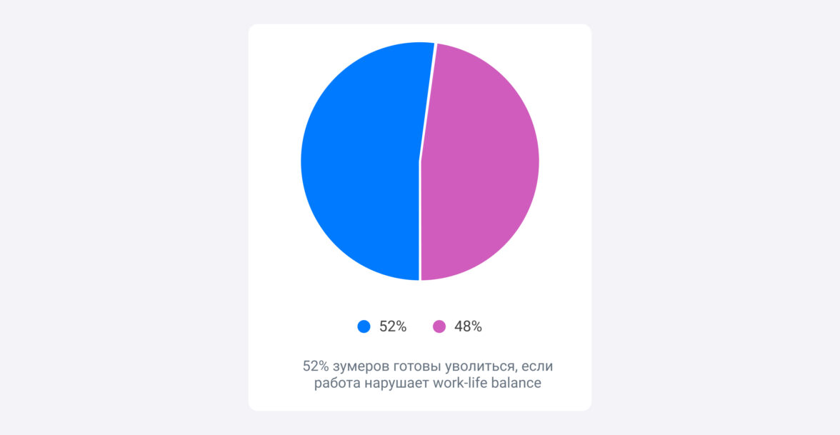 В 2024 году компания Monster опубликовала отчет, из которого следует, что 92% опрошенных зумеров (а это 1000 выпускников 18–24 лет) хотят обсуждать вопросы психического здоровья на работе и при этом чувствовать себя комфортно. В том же отчете можно увидеть, что 52% зумеров готовы уволиться, если работа будет забирать слишком много времени и негативно сказываться на личной жизни.