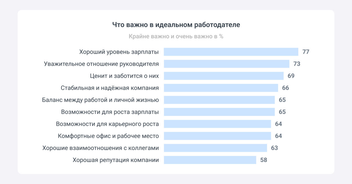 Нередко можно услышать о том, что молодых сотрудников меньше всего интересуют деньги. Но это не так — высокая зарплата для зумеров тоже важна. По данным ресурса Glassdoor, упоминание фразы «хорошая оплата» входит в тройку лидеров, когда представители поколения Z обсуждают преимущества работы и работодателей. Но в ту же тройку входят фразы «рабочая среда» и «гибкий график» — это еще раз подтверждает то, о чем мы писали ранее.