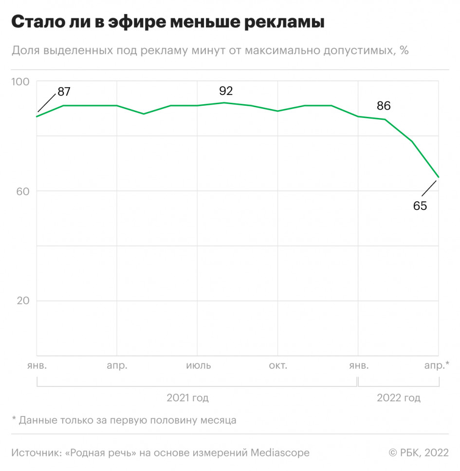 По оценкам «Родной речи», доля выделенных под рекламу минут в эфире телеканалов в апреле также существенно снизилась. Согласно закону №38-ФЗ «О рекламе», телеканалы могут отводить под рекламу 12 минут в час. При этом общая продолжительность всех рекламных блоков не должна превышать 3 часов 36 минут в сутки.