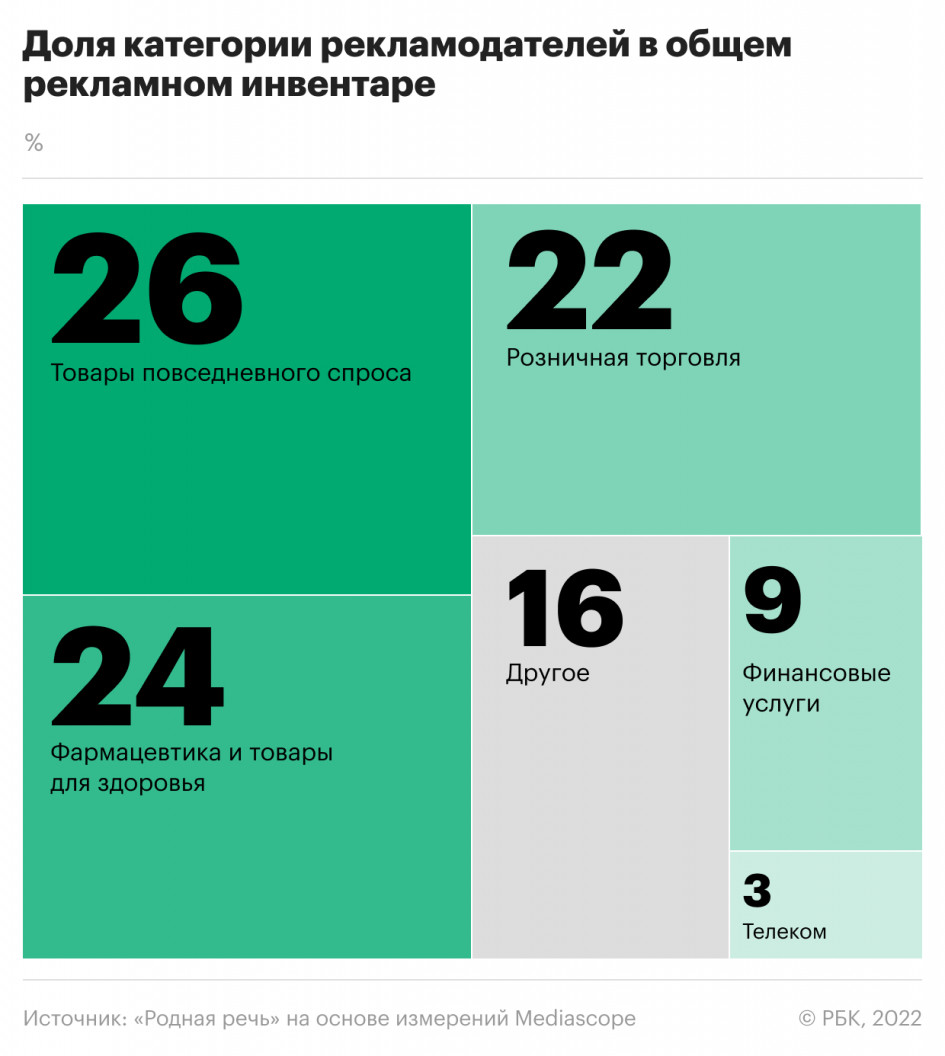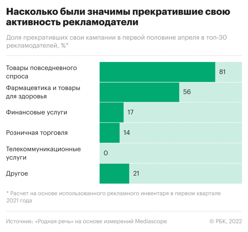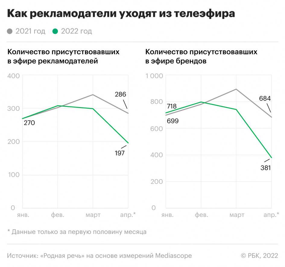 В первой половине апреля бренды вдвое снизили присутствие в эфире российских телеканалов. Больше всего пострадали категории товаров повседневного спроса (FMCG) и фармацевтика, которые потеряли более половины рекламодателей. По подсчетам группы компаний «Родная речь», остановившие свои кампании с начала месяца выкупили в первом квартале прошлого года 52% всего рекламного инвентаря. А общая продолжительность рекламы в федеральном эфире телеканалов уменьшилась с трех до двух часов в сутки.