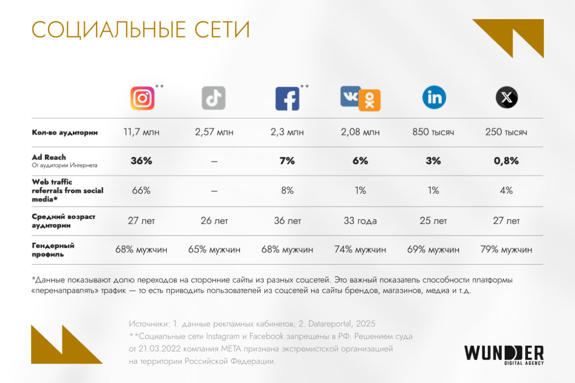 По данным DataReportal, Instagram* занимает ведущие позиции, обеспечивая две трети всех переходов на внешние сайты из соцсетей. TikTok на втором месте, но его аудитория в 5 раз меньше. Площадка заблокирована, а монетизация отсутствует. Мужчины активно участвуют в публичных обсуждениях, в то время как женщины чаще используют мессенджеры, такие как Telegram.