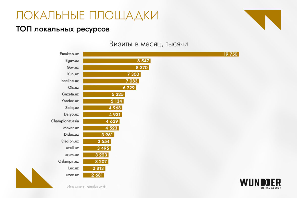 В Узбекистане активно развиваются локальные цифровые сервисы, включая образовательную платформу eMaktab, новостные порталы Kun.uz, Gazeta.uz и Daryo.uz, платформу объявлений OLX.uz и сервис электронных налоговых услуг Soliq.uz. Также популярны спортивный портал Championat.asia, платформа для документооборота Didox.uz и сайт для покупки автомобилей Avtoelon.uz. Эти ресурсы предлагают новые возможности для бизнеса.