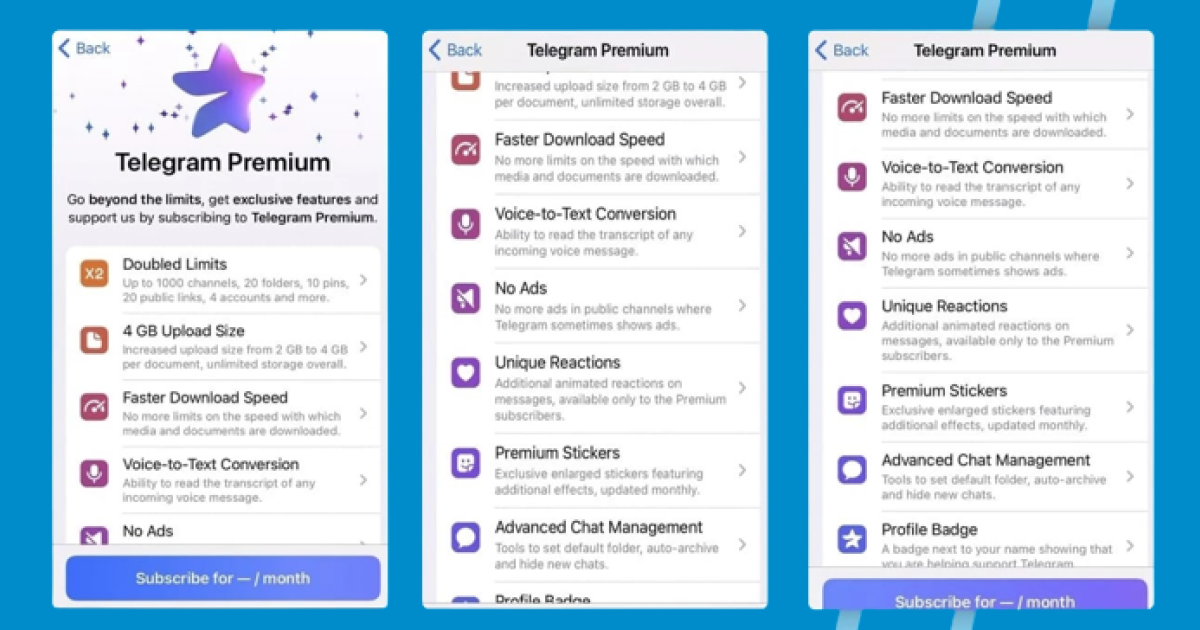 В сеть «утекли» новые подробности о платной подписке «Телеграм». Среди главных фишек — возможность загрузки больших файлов весом до 4 ГБ, уникальный значок подписчика рядом с именем профиля, увеличение скорости загрузки контента, отключение встроенной рекламы, а также функция расшифровки голосовых сообщений. Правда, официального анонса премиум-подписки до сих пор не было — когда она появится и сколько будет стоить, пока не знает никто.