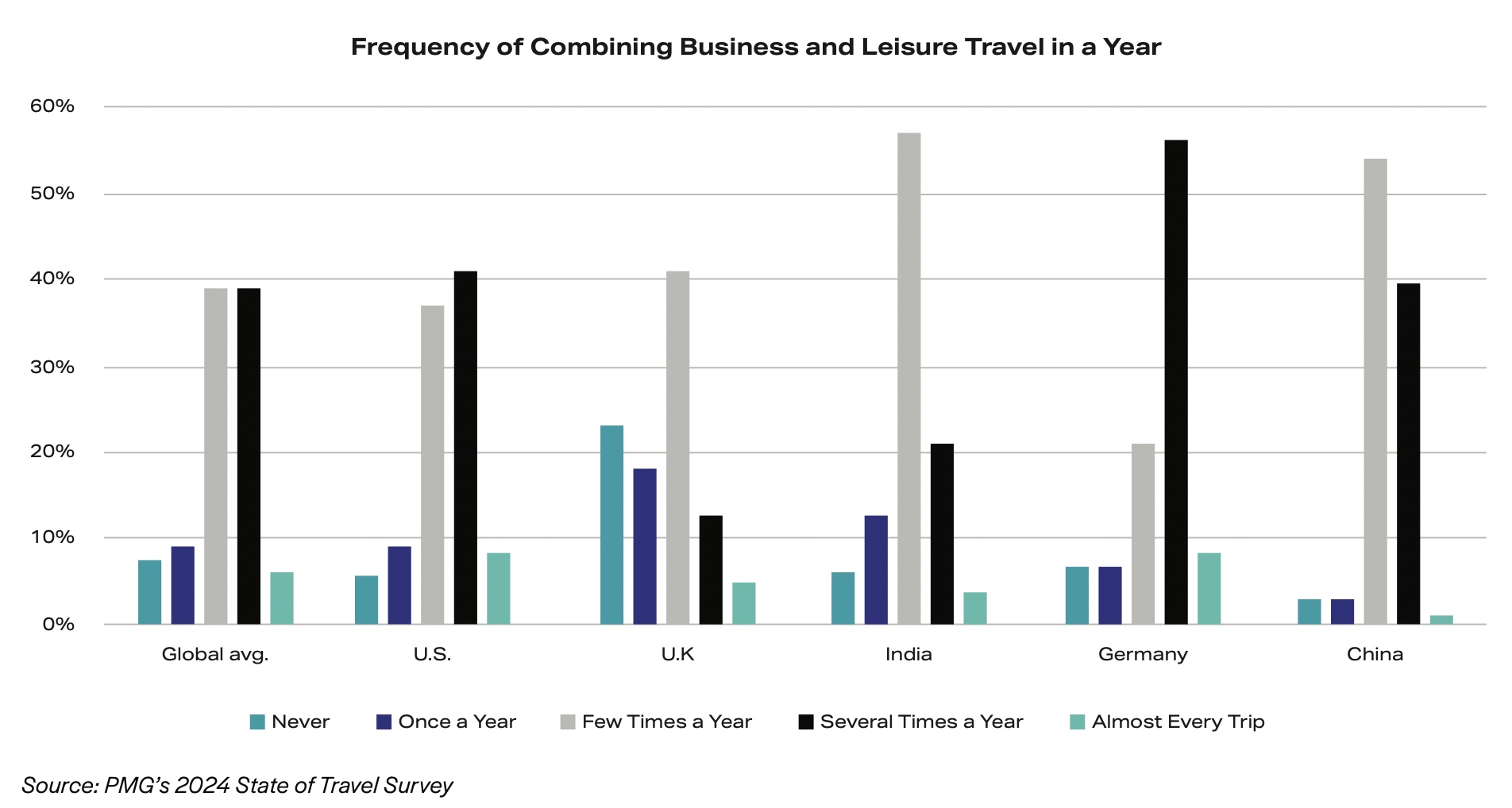 Одна из новых тенденций в туризме, особенно сильно проявившаяся во время пандемии, но сохраняющаяся до сих пор — bleisure travel (от слов business и leisure, соединение работы с отдыхом, адекватного российского термина вроде «биздых» пока не существует). Особенной популярностью bleisure travel пользуется у жителей Северной Америки и Западной Европы, где сильнее развита удаленная работа. Около 40% участников опроса PMG заявили, что в этом году собираются неоднократно соединять работу с отдыхом в чужих краях. Более половины опрошенных из Китая и Индии отдыхают-работают подобным образом хотя бы несколько раз в год. Более половины жителей Германии многократно так поступали.