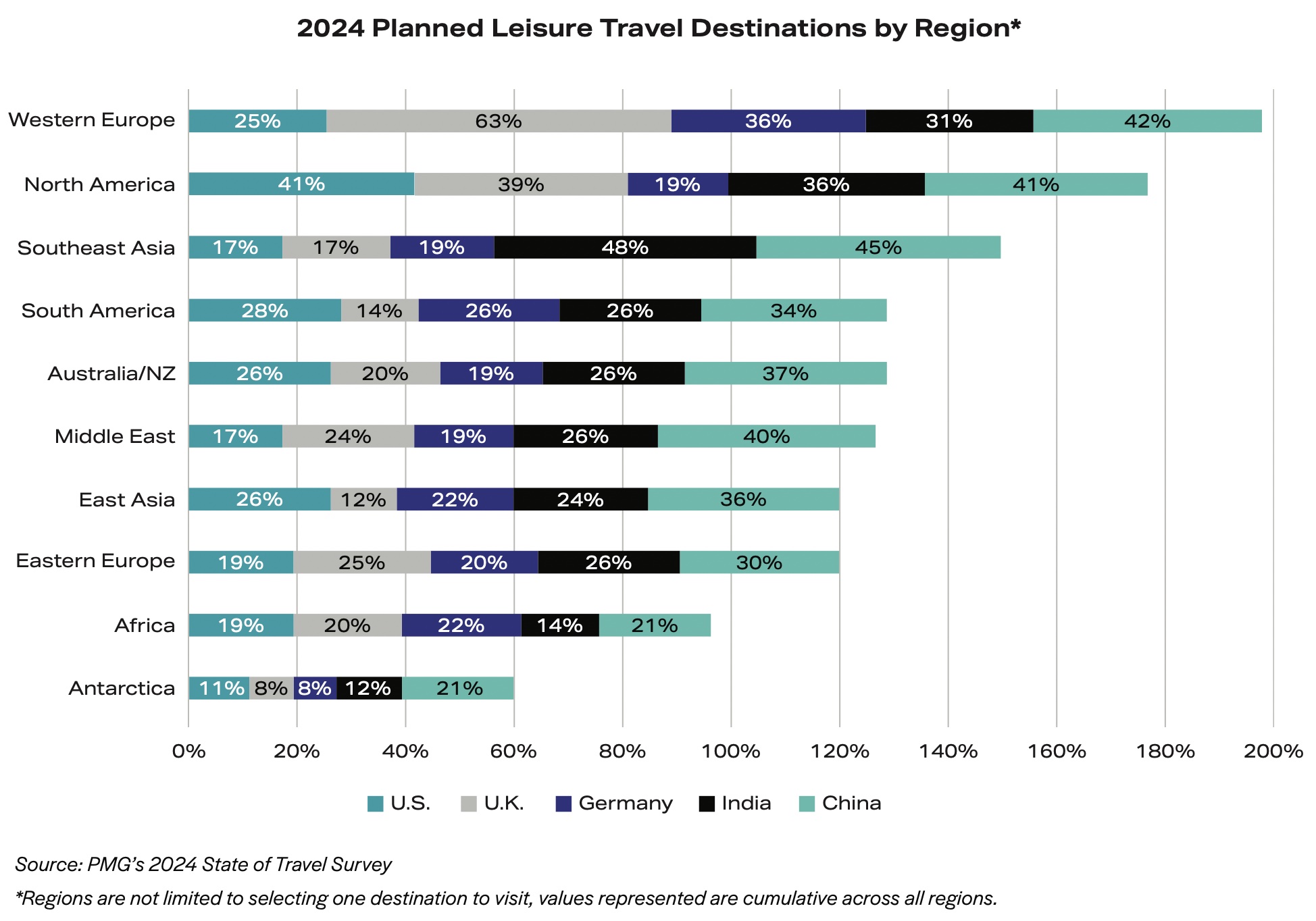 52% опрошенных заявили, что в этом году совершают поездки как по своей стране, так и за рубеж. Наибольшей популярностью пользуется Западная Европа (туда намерены поехать 43% опрошенных). Популярность других регионов выглядит так: Северная Америка — 39%, Юго-Восточная Азия — 25%, Восточная Европа — 23%, Восточная Азия, Австралия и Новая Зеландия, Ближний Восток — по 22%, Южная Америка — 21%, Африка — 15%, Антарктида — 10%. Индийцам больше всего нравится Юго-Восточная Азия, англичанам — Западная Европа, немцам — Африка, жителям США — остальные регионы. Если брать конкретные страны, то первая пятерка выглядит так: США, Испания, Франция, Италия, Япония.