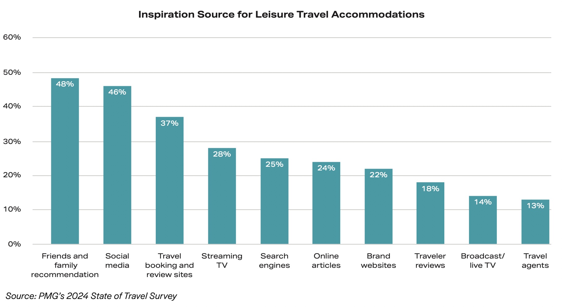 Принимая решение о том, где поселиться на отдыхе, 48% путешественников ориентируются на мнение родственников и друзей. 46% находят соответствующую информацию в соцсетях. 37% читают отзывы на сайтах по бронированию. Далее в порядке убывания идут следующие источники информации: стриминговое ТВ (28%), поиск в сети (25%), статьи в интернете (24%), сайты брендов (22%), отчеты путешественников (18%), эфирное ТВ (14%). На последнем месте по степени доверия — советы турагентов (13%).