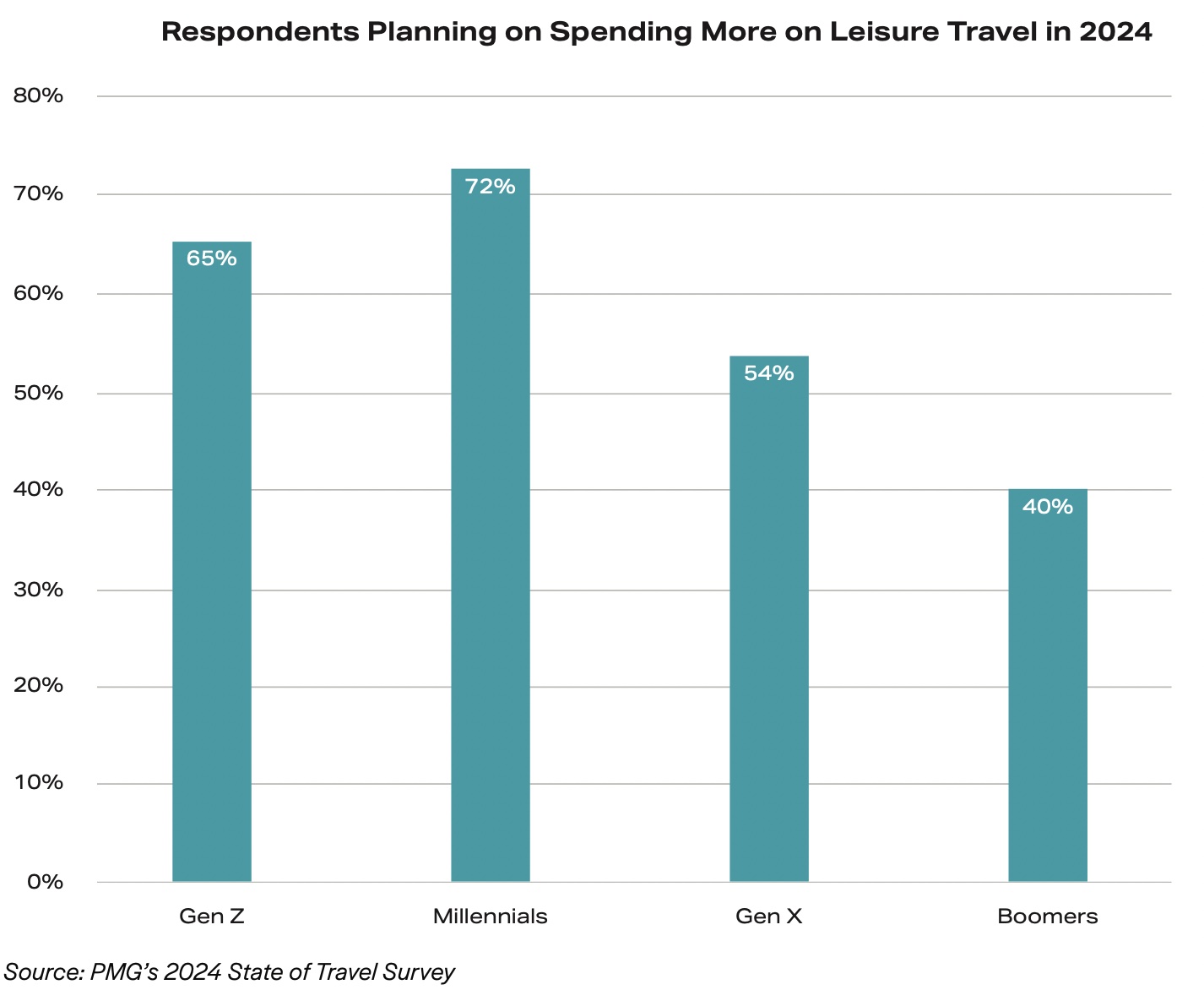 Отношение к расходам на турпоездки зависит от поколения. Представители поколения бэби-бумеров (примерные годы рождения — с 1946-го по 1964-й) скупее всего — лишь 40% из них будут тратить в 2024 году больше, чем в 2023 году. Среди поколения Х (годы рождения — с 1965-го по 1980-й) на большие траты настроены 54%.