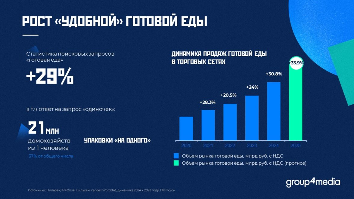 • Выросло проникновение онлайн-канала в категории готовой еды (+29%) и продуктов «для одного» (21 млн домохозяйств из 1 человека, 37% от общего числа) — это напрямую связано с ростом числа одиночных домохозяйств**;