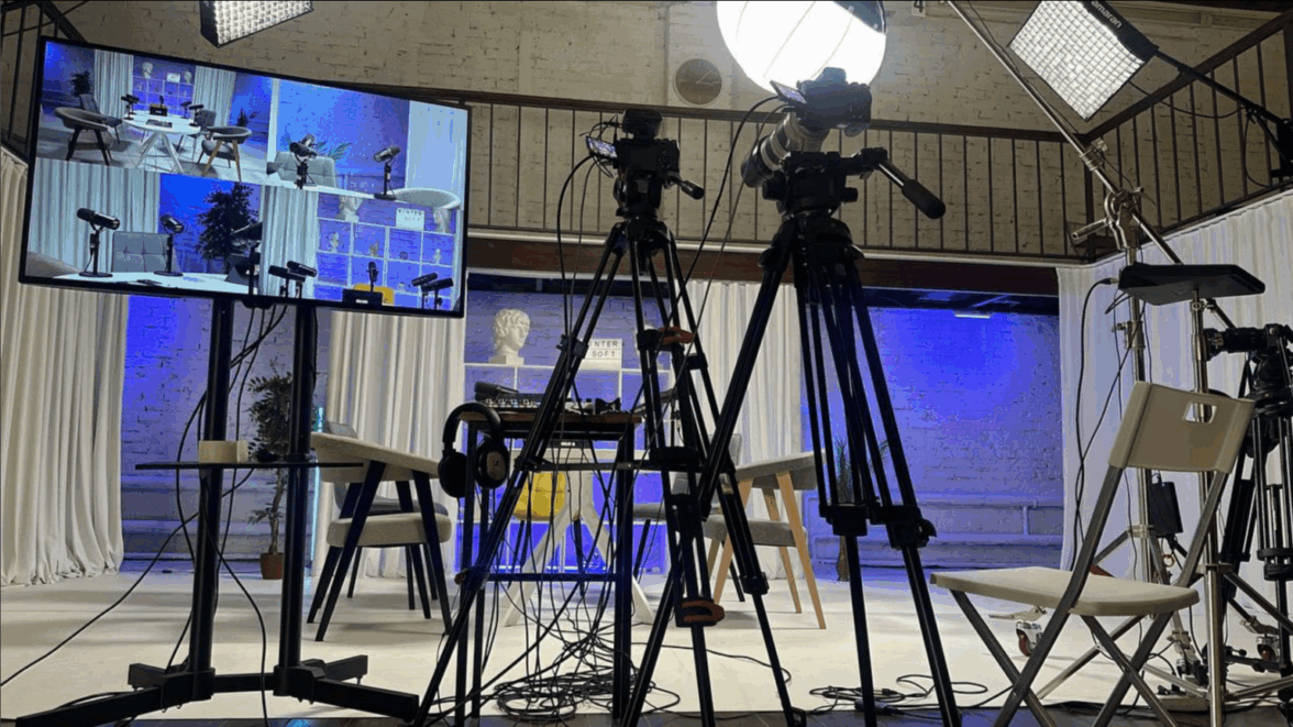 Расположение камер динамично: есть крепления, подвесы, пантографы для съемок с высоких точек. Можно ставить до пяти камер, делать телевизионные «восьмерки» (прим.ред. — правило 180 градусов — способ съемки, при котором между людьми мысленно проводится «ось общения», а камеры располагаются по одну сторону этой оси).