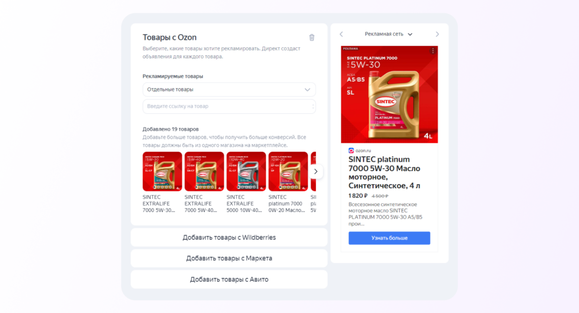 Можно рекламировать как отдельные товары, так и всю продукцию — Директ автоматически создает объявления с выбранными товарами и показывает их в Поиске и РСЯ.