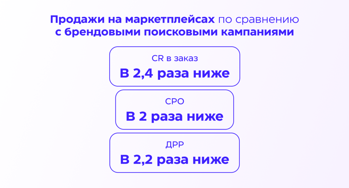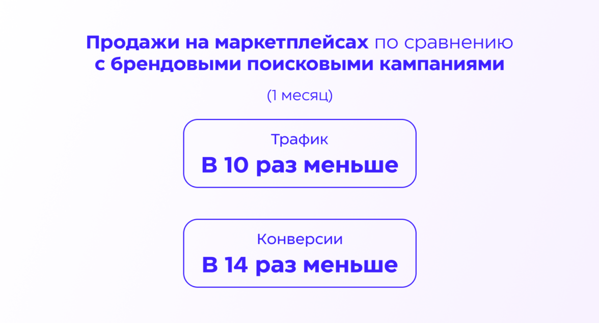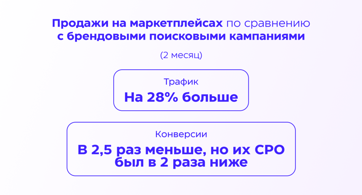 За 2 месяца тестов инструмента «Продажи на маркетплейсах» по сравнению с показателями брендовой поисковой кампании мы получили: