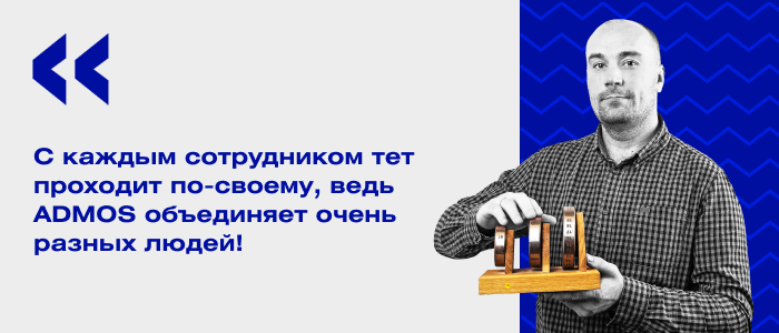 Личные встречи с сотрудниками — важная часть корпоративной культуры ADMOS. На тетах мы ставим цели, обсуждаем прошлые встречи, результаты, определяем, что нужно исправить, что хорошо получается. Они не только помогают оставаться в контакте с командой, но и мотивируют на важные изменения: прокачать профессиональный уровень, попробовать себя в другом отделе или на руководящей должности. В ADMOS мы слышим каждого и находим поход ко всем членам нашей большой семьи.