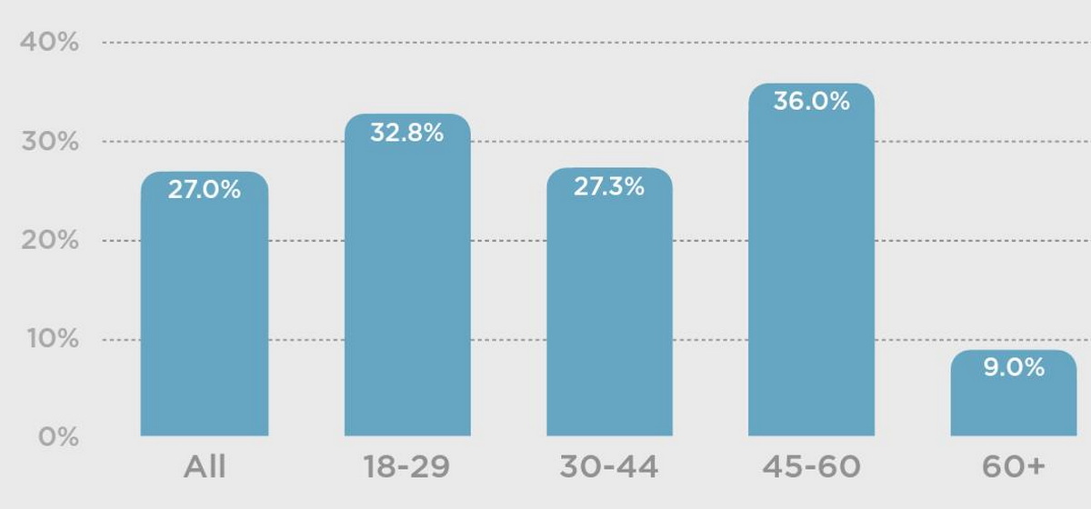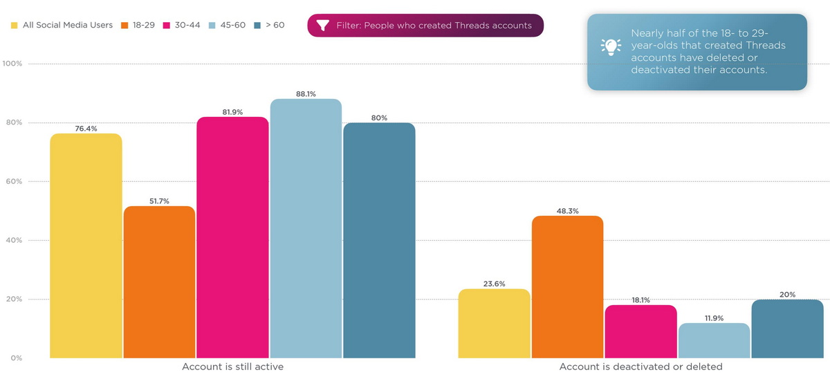 В первую неделю после запуска 27% участников опроса создали в ней аккаунт. Самый большой энтузиазм к новинке продемонстрировали представители поколения X (1965 — 1980 г. р.). На них пришлось 36% установок приложения в первую неделю. Далее идут зумеры (1997-2012) с 32,8%. Третье место у миллениалов (1981 — 1996) — 27,3%. Меньше всего интереса к новинке проявили беби-бумеры (1946-1964): лишь 6% респондентов этой возрастной группы подключились к Threads в первую неделю после выхода приложения.