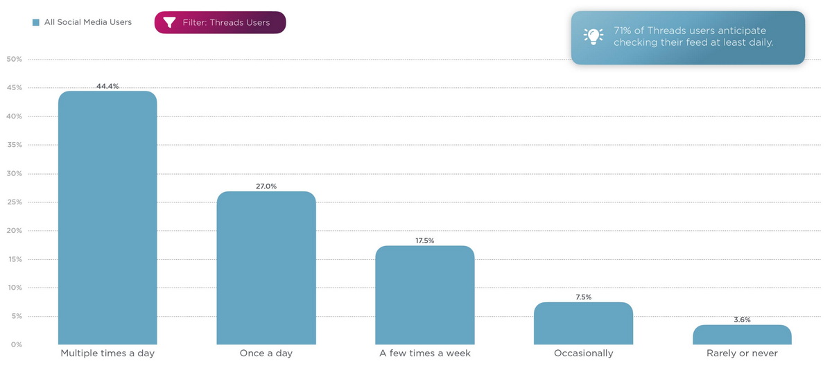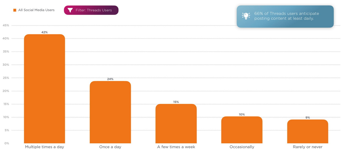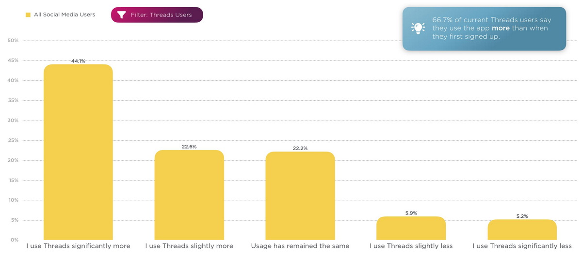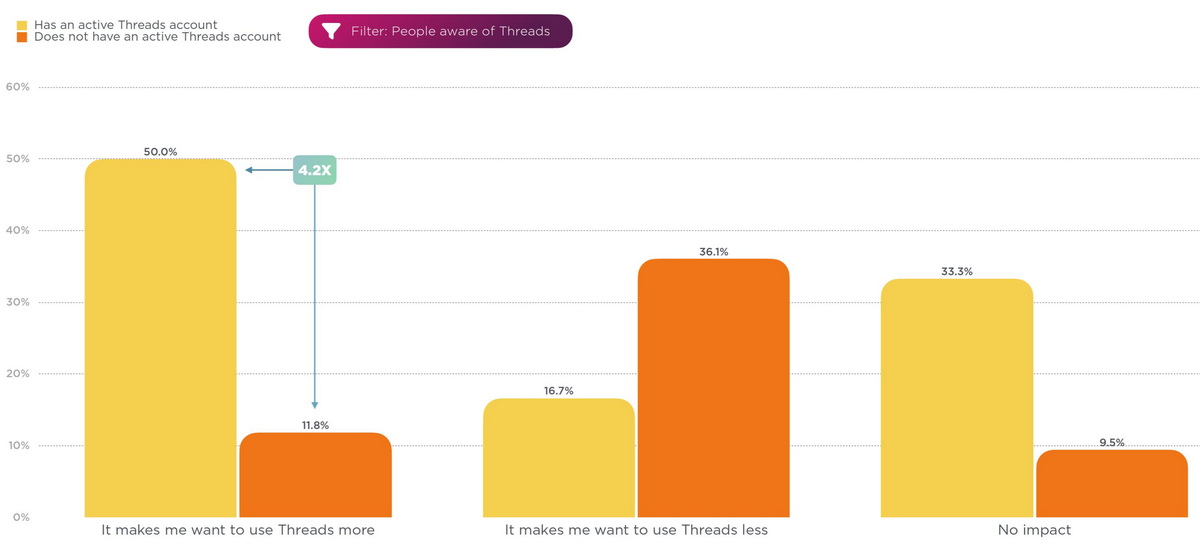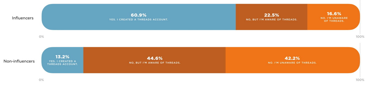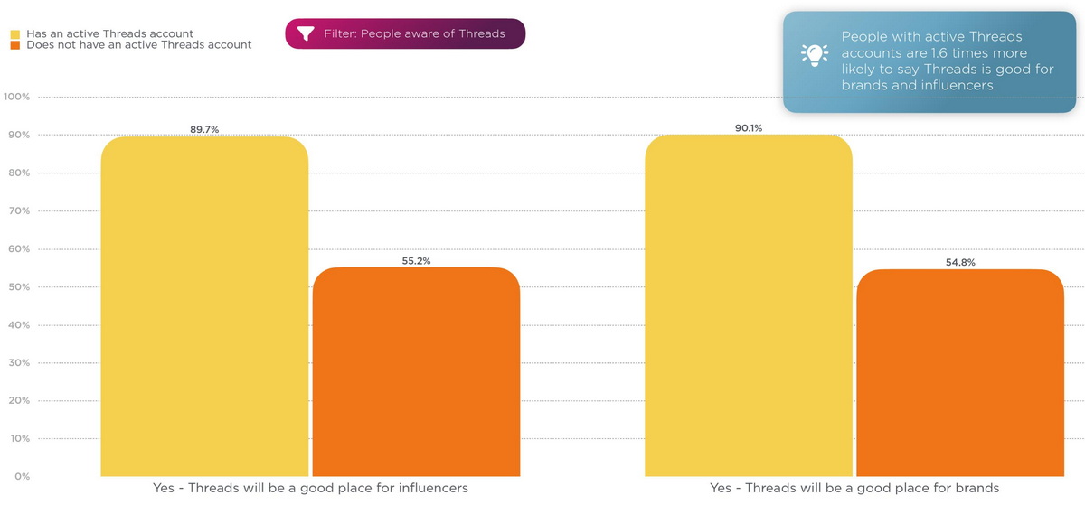 На вопрос «Станет ли Threads хорошей платформой для размещения на ней контента инфлюенсерами и брендами?» 89,7% респондентов, уже имеющих аккаунт на платформе, и 55% неподключенных к новому соцмедиа ответили утвердительно относительно инфлюенсеров. 90,1% и 54,8% — соответственно относительно брендов.