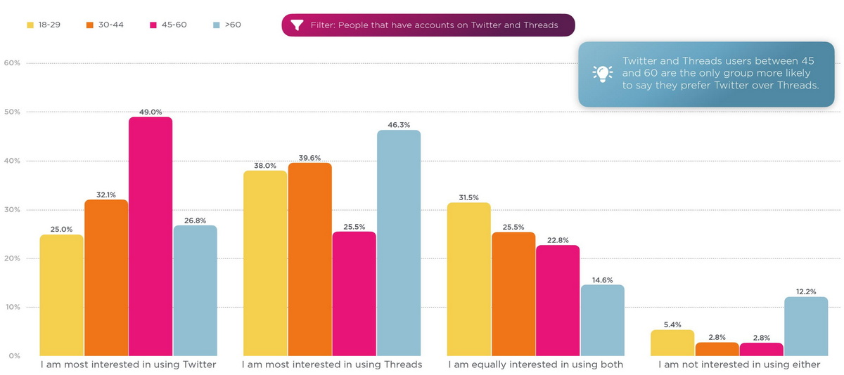Несмотря на то что больше всего новинкой заинтересовались люди в возрасте от 45 до 60 лет, почти половина из них (49,9) считает, что им приятнее пользоваться X. Вторым открытием аналитиков стало то, что самая неактивная после появления Threads группа респондентов, в возрасте старше 60 лет думает, что пользоваться Threads им интереснее чем Х. Самые молодые участники опроса (18-29 лет) оказались и самыми гибкими: 31,5% участникам этой возрастной группы интересны обе платформы.