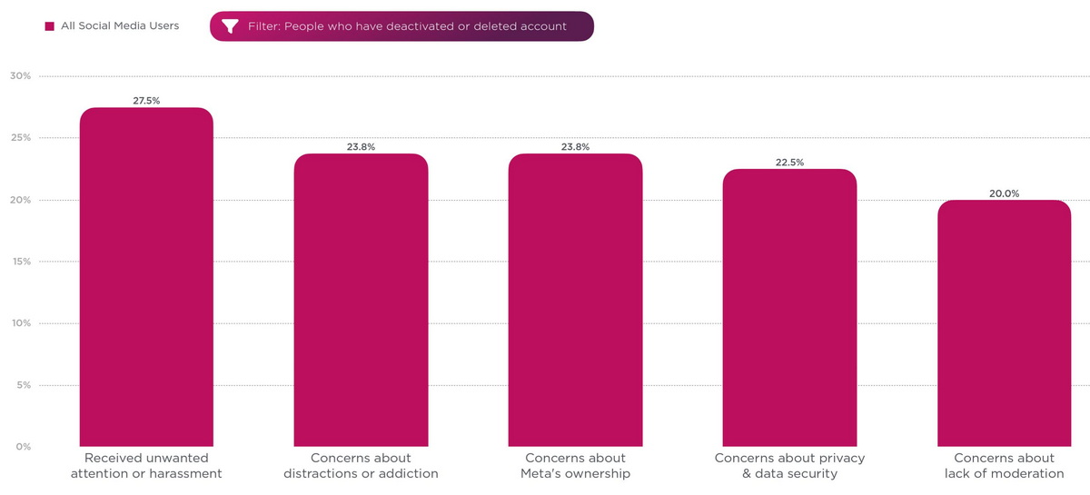 Большинство (27,5%) ушедших из новой соцсети участников опроса рассказало, что сделало это из-за излишнего внимания или харассмента со стороны других пользователей платформы. 23,8% испугалось, что новинка будет отвлекать внимание или вызовет зависимость. Стольким же не понравилось, что Threads управляется корпорацией Meta. 22,5% респондентов заявило, что ушло из-за беспокойства за сохранность своей приватности и персональных данных. Меньшинство (20%) обосновало свой уход действиями модераторов соцсети.