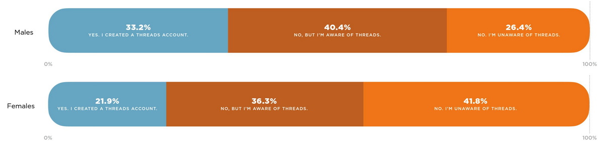 Респондентам-мужчинам новое соцмедиа понравилось больше: 33,2% из них уже создали аккаунт в Threads. К ним присоединились 21,9% женщин-участников опроса. Среди тех, кто еще не обзавелся своей страничкой на платформе, 40,4% мужчин и 36,3% женщин, рассказали, что знают о появившейся новинке, а 26,4% и 41,8%, соответственно, ничего про нее не слышали.