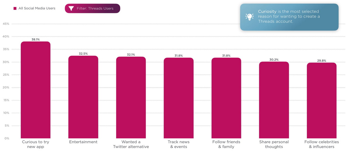 Главной причиной, из-за которой в Threads хлынул поток пользователей, 38,1% респондентов назвали любопытство, а 32,5% — желание развлечься. В поисках замены X (Twitter), на платформу пришли 32% опрошенных. Следить за новостями в новом соцмедиа собирается 31,8% участников опроса и столько же установили приложение, чтобы узнать больше о друзьях и знакомых. Ознакомить желающим с собственным мнением по тем или иным вопросам в новом соцмедиа, планирует 30,2%.