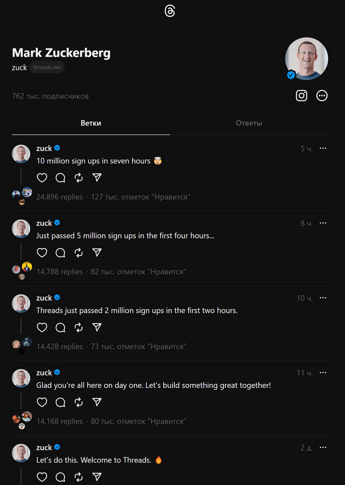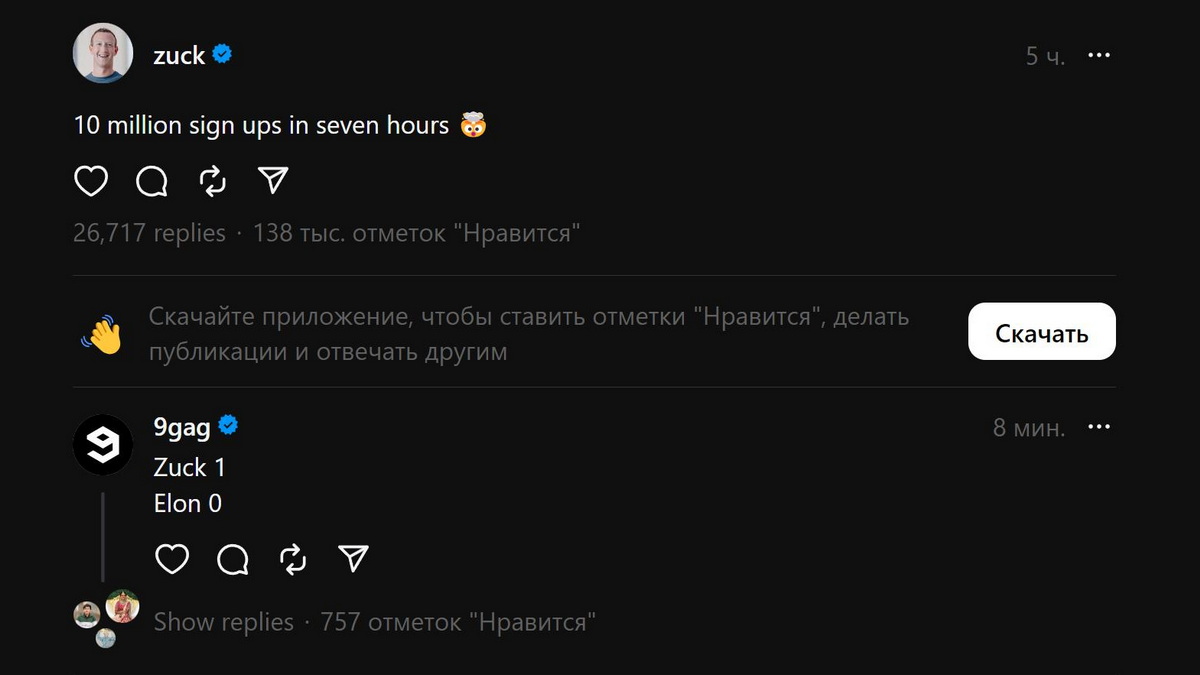 Хотя кое-какие цифры все-таки есть. В своем последнем, на момент написания статьи, треде Марк Цукерберг написал, что за 7 часов после запуска соцсеть набрала 10 млн подписчиков. Самый популярный комментарий под этим постом: «Zuck 1 / Elon 0».