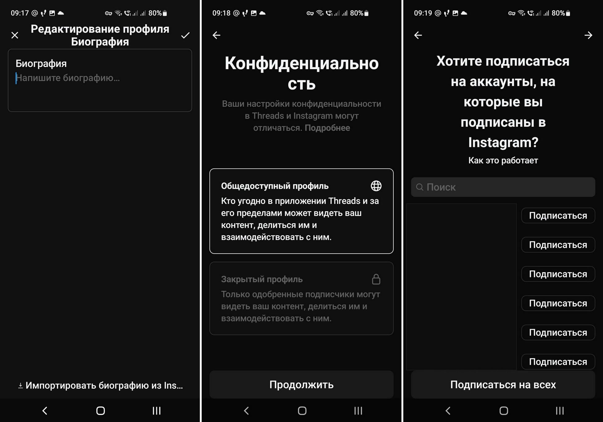После выбора аккаунта пользователю предлагается выбрать настройки конфиденциальности его профиля в Threads. Он может быть общедоступным или закрытым. Во втором случае, читать посты автора, реагировать на них и оставлять комментарии смогут только подписчики. Следующая страница настройки приложения как раз посвящена подписчикам. Новому пользователю предлагается или воспользоваться поиском, или подписаться на аккаунты, которые ему интересны в Instagram. Также предлагается опция массовой подписки — «Подписаться на всех». В этом случае, пользователь автоматически подпишется на всех любимых авторов, импортированных из материнской соцсети.