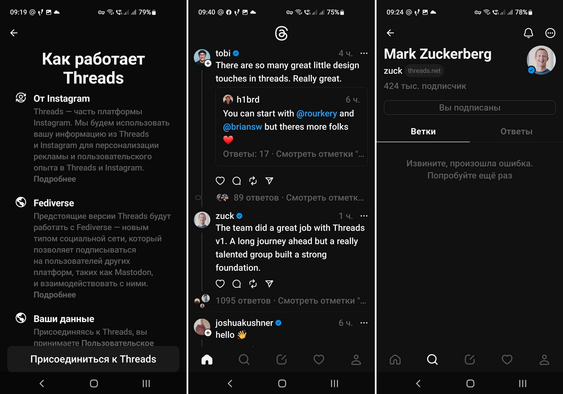 Казалось бы, это все. Но попытка добавить к имени домена название аккаунта увенчалась успехом. Добавив по аналогии с Instagram «zuck» (никнейм Марка Цукерберга), можно попасть на веб-версию его страницы в Threads. Meta сразу выкатила и приложение, и его рабочую веб-версию.