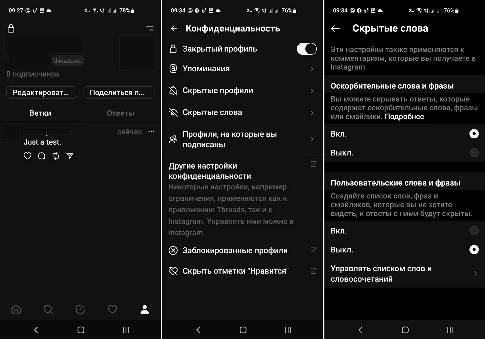 На своей странице пользователь может отредактировать информацию о себе и поделиться профилем. Также здесь собраны все треды автора и ответы на них. В настройках профиля в Threads проще (или пока беднее), чем в Instagram*. Любопытно, что в разделе «Конфиденциальность» есть подраздел «Скрытые слова». Пользователю предлагается два текстовых фильтра: один предустановленный, в котором содержится готовый список оскорбительных слов и фраз (к сожалению, без возможности ознакомления), второй — пользовательский, куда можно добавить любые слова, вызывающие у владельца аккаунта негативный отклик.