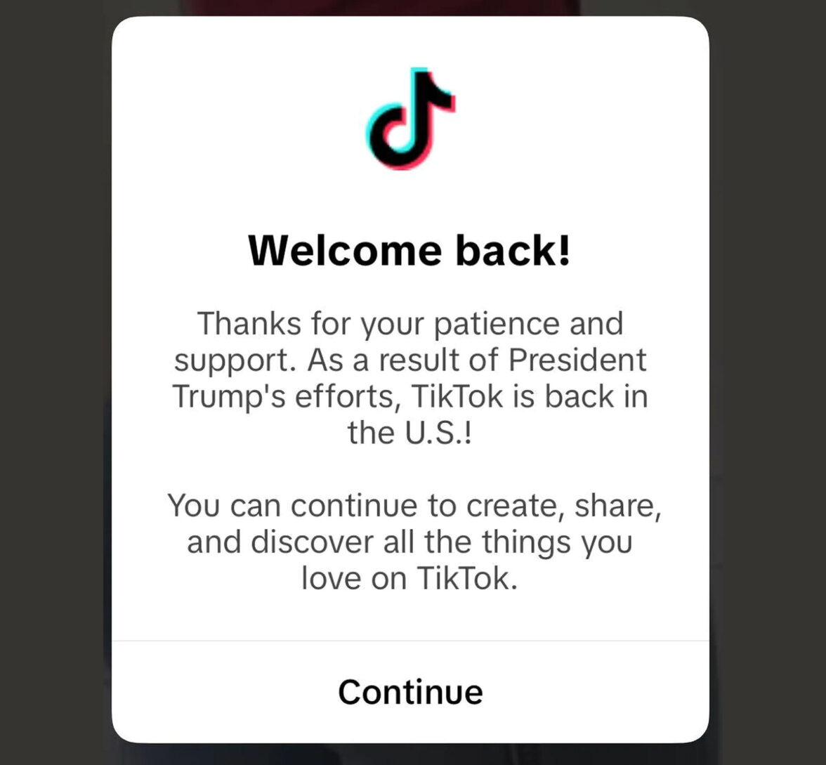 Спустя два часа после публикации этого поста, около полудня по времени восточного побережья США, доступ к приложению и веб-версии соцсети начал восстанавливаться. Пользователей приветствовали сообщением о том, что «благодаря усилиям Президента Трампа, TikTok вернулся в США».