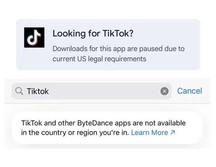 В магазинах приложений Apple и Google удаленное оттуда приложение пока так и не появилось — видимо, для IT-гигантов, находящихся под пристальным вниманием антимонопольных органов, формальное соблюдение закона все же важнее, чем слова пока еще не ставшего президентом Дональда Трампа. Если попытаться найти TikTok, сторы показывают такие сообщения: