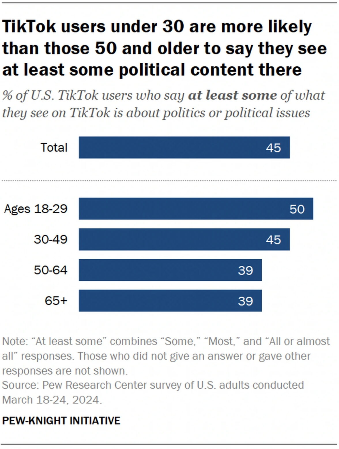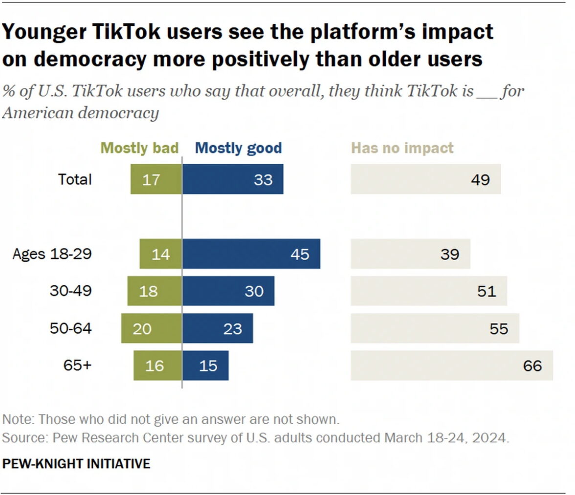 Мнения о том, что TikTok хоть как-то влияет на демократию, разделились: 49% опрошенных сказали «нет, а 50% — “Да”. Среди тех респондентов, кто заметил влияние китайской соцсети на американскую демократию, 33% считают, что TikTok оказывает на демократический процесс положительное влияние, а 17% — отрицательное. При этом более юные пользователи соцсети настроены оптимистичнее. 45% людей в возрасте от 18 до 29 лет, оценивают влияние TikTok на демократию в основном положительно, и лишь 14% — отрицательно. С увеличением возраста эта пропорция постепенно меняется пока не достигает баланса у респондентов старше 65 лет, где это соотношение составляет 15% к 16%.
