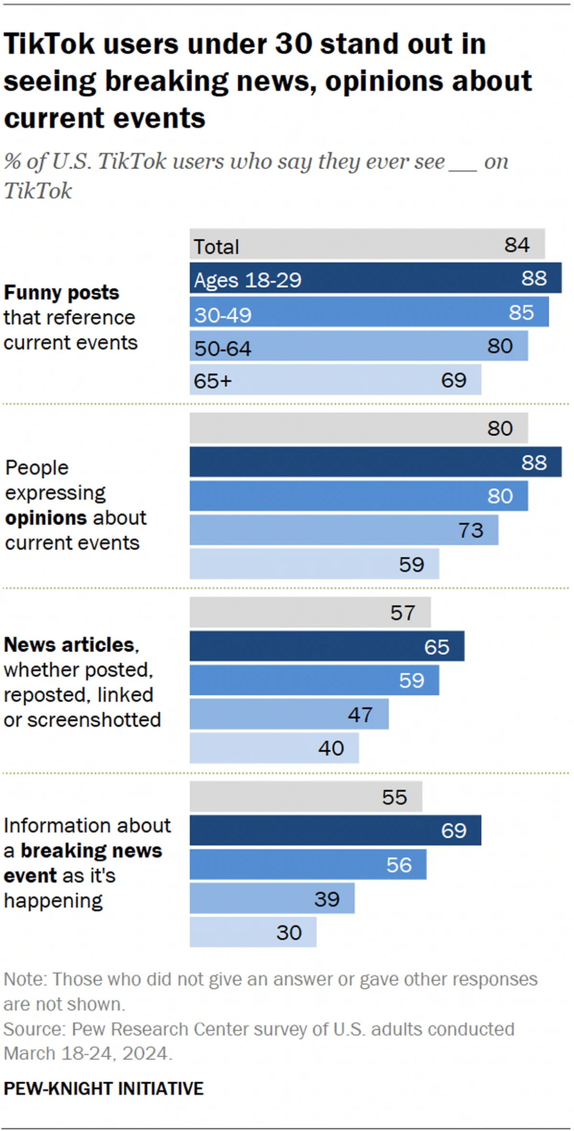 TikTok — соцсеть с развлекательным контентом. Независимо от того, обращаются ли они к TikTok просто за развлечениями, большинство участников (84%) опроса рассказали, что им попадается забавный контент, связанный с новостями. 80% респондентов видели ролики, как люди выражают свое мнение о текущих событиях. 57% — когда-либо видели в TikTok новостные статьи из других источников, а 55% — информацию о важном новостном событии по мере его развития.