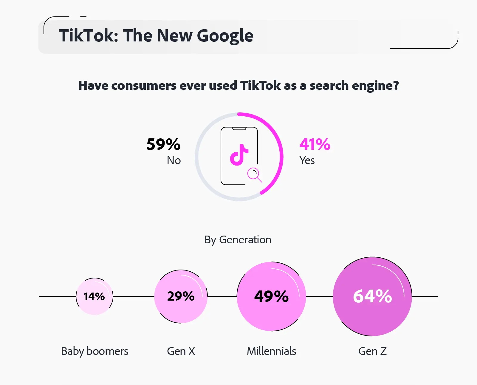 40% пользователей TikTok используют платформу как универсальный поисковик, считает компания Adobe. Компания опросила 800 рядовых пользователей соцсети и 250 представителей бизнеса и выяснила, что TikTok в качестве универсального инструмента поиска наиболее популярен у поколения Z, 64% из которых используют китайское соцмедиа не только для развлечения, но и ищут в нем новости, товары и услуги. Так же к TikTok относится и почти половина миллениалов (49%) и треть поколения X (29%).