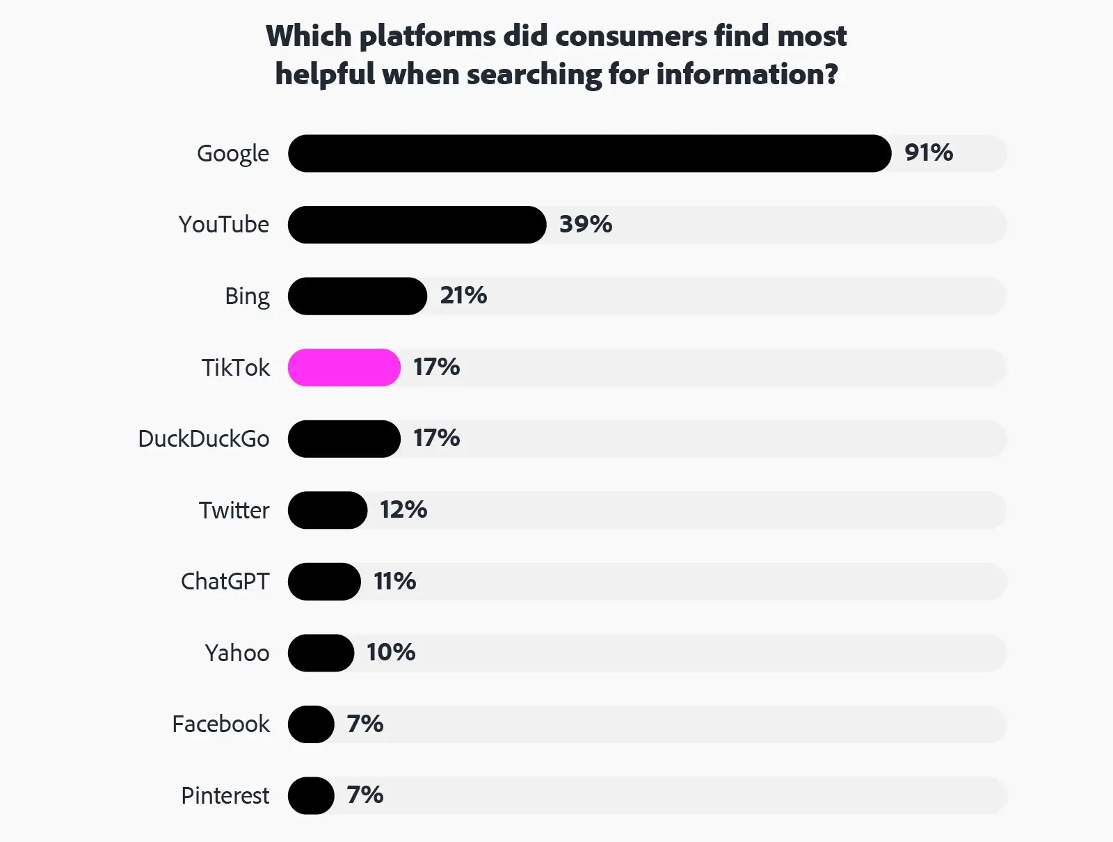 Более того, судя по данным опроса, TikTok «дышит в спину» настоящим поисковым системам. Китайской соцсети как источнику наиболее полезной информации доверяют 17% респондентов (столько же набрал и независимый поисковик DuckDuckGo), а вечно догоняющему Microsoft Bing – 21%. При этом лидерство Поиска Google никто не оспаривает – ему доверяют 91% опрошенных.