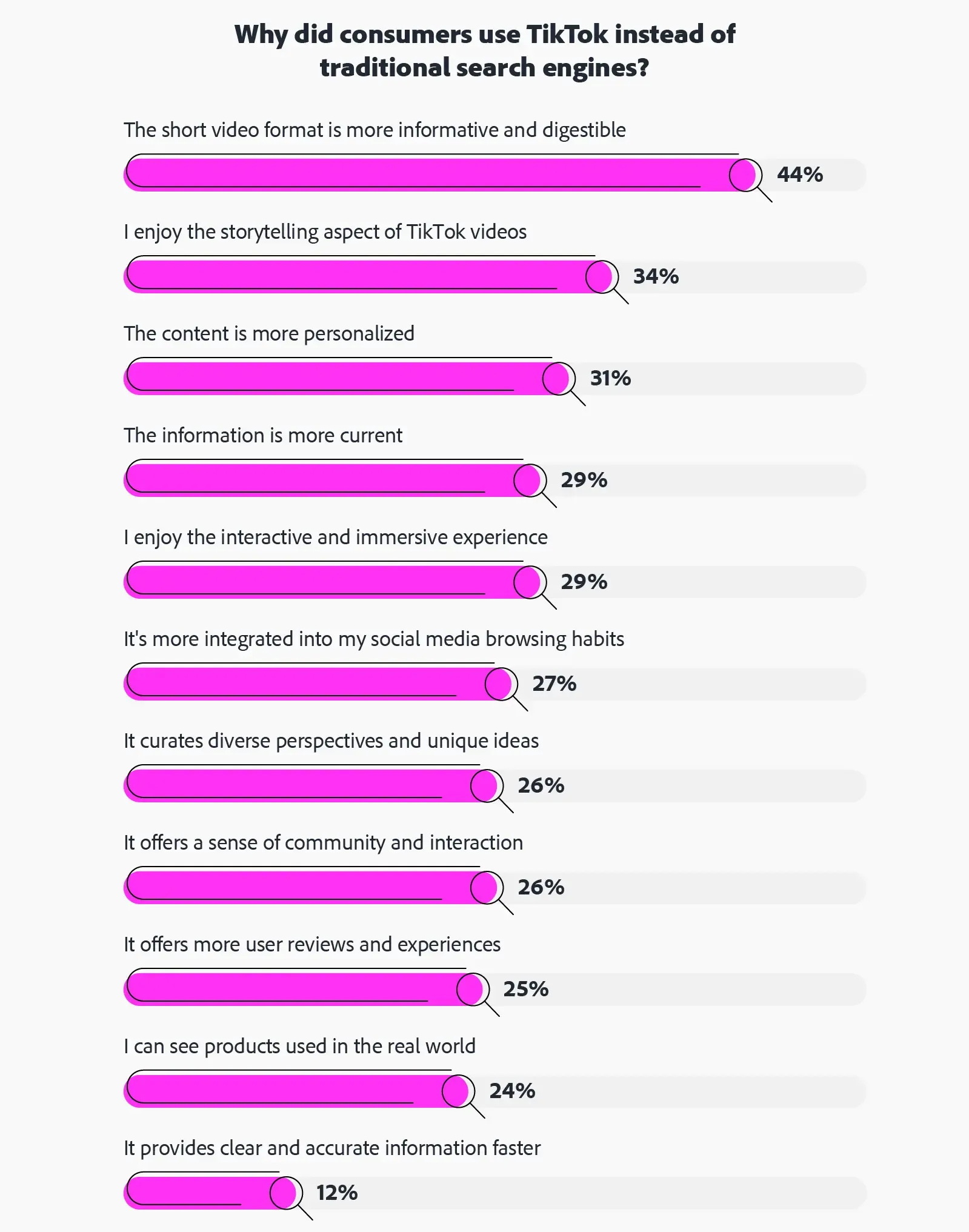 Основной причиной популярности TikTok как поискового инструмента является его формат. По мнению 44% участников опроса, короткие видео более информативны и доступны для понимания. 34% респондентов нравится манера повествования в клипах, а 31% считает, что информация в роликах более персонализирована, чем в привычных поисковиках.