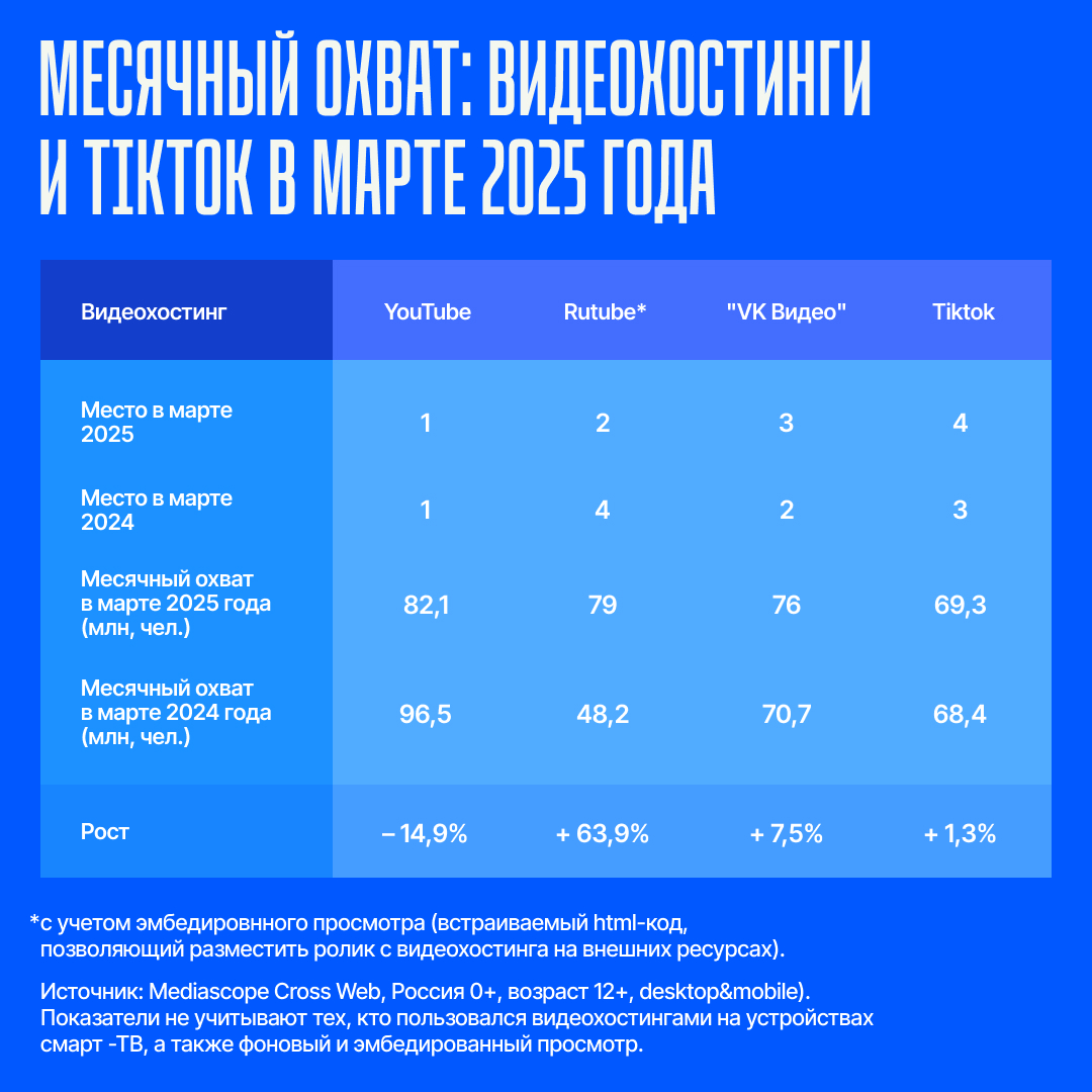 Согласно данным Mediascope, самые высокие темпы роста среди социальных видеоплатформ и видеохостингов демонстрирует Rutube. Среднедневная активная аудитория российского видеохостинга с марта 2024 года по март 2025-го выросла на 240%, с 5,2 млн до 17,7 млн человек. Месячный охват за тот же период увеличился на 63,9%, с 48,2 млн до 79 млн человек. Но нужно учитывать, что в эти данные Mediascope включен эмбедированный просмотр на других сайтах (встраиваемый html-код, позволяющий разместить ролик с видеохостинга на внешних ресурсах), а другие видеохостинги считаются без него.