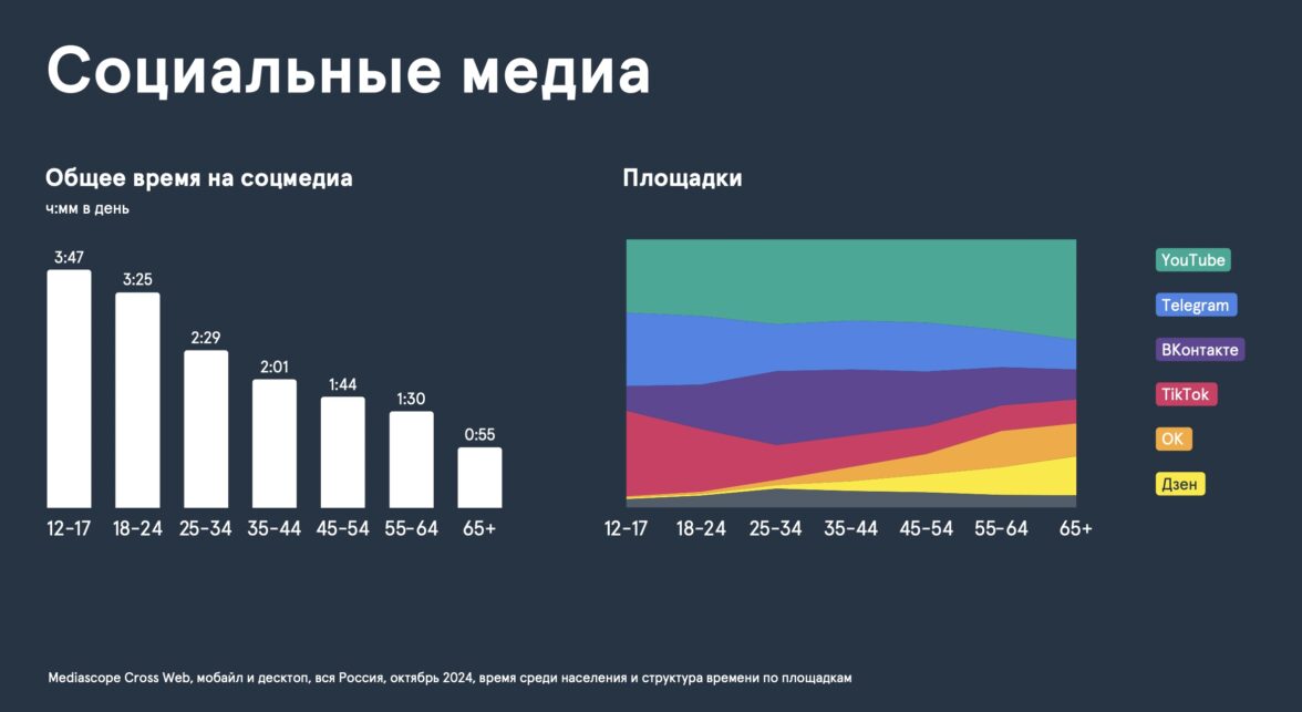 Молодежь в возрасте от 18 до 24 лет тоже активно пользуется TikTok: из 205 минут на соцмедиа в день в TikTok они проводят 48 (23,4%). Но в этой возрастной группе площадка уступает YouTube и Telegram — на них приходится 59 и 53 минуты соответственно (28,8% и 25,9%).