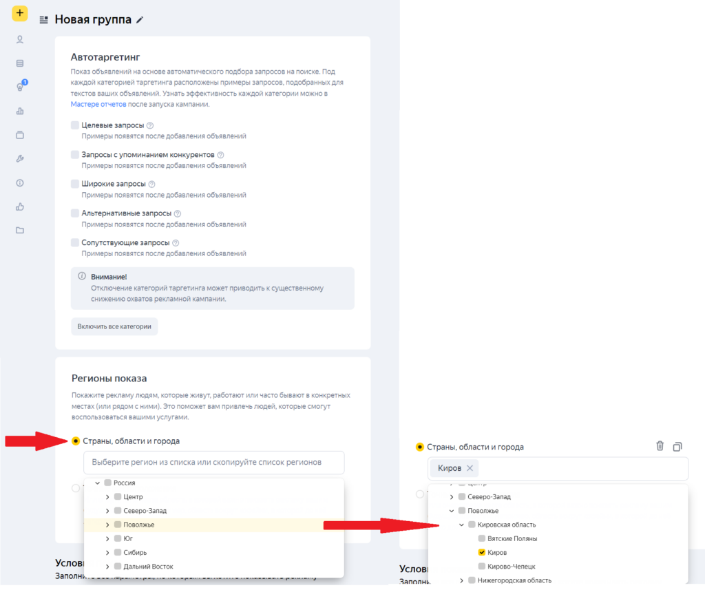 Расширенным — показ объявлений по запросам, содержащим название региона, независимо от местоположения пользователя.