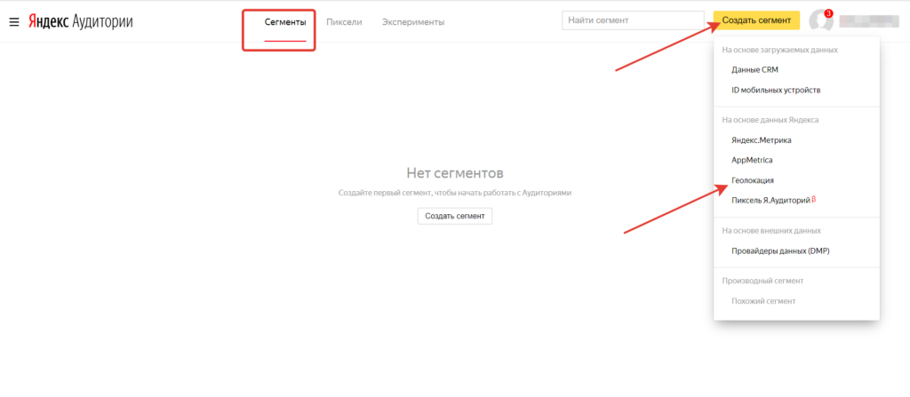 На странице сервиса в разделе «Сегменты» нажимаете кнопку «Создать сегмент». Из выпадающего списка выбираете — геолокация.