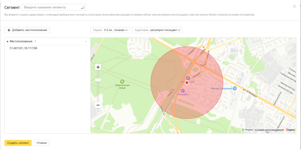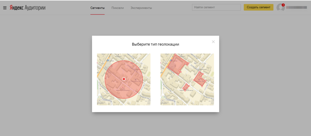На этой площадке мы можем создавать сегменты пользователей по геолокации двух типов: радиусы и полигоны.
